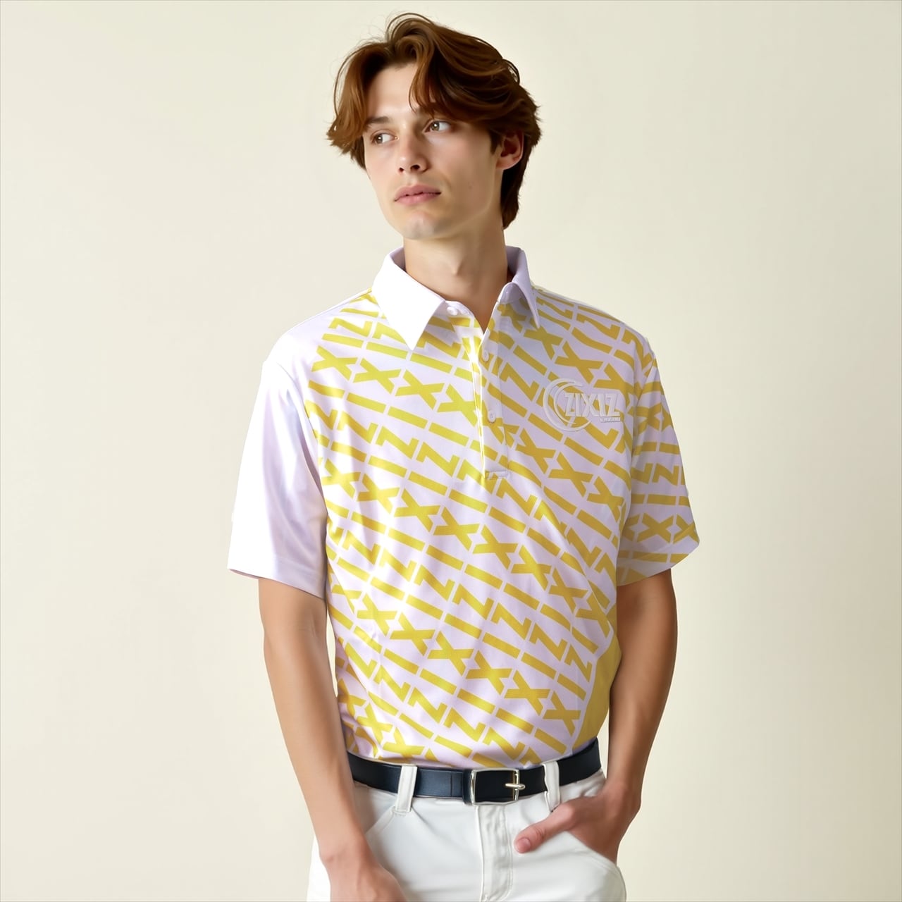 ZIXIZ柄イエローカラー メンズゴルフウェアは、爽やかな印象を与えるデザインと高い機能性を兼ね備えた、夏ゴルフに最適な1枚です。期間限定で特別価格でご提供いたしますので、この機会をお見逃しなく!